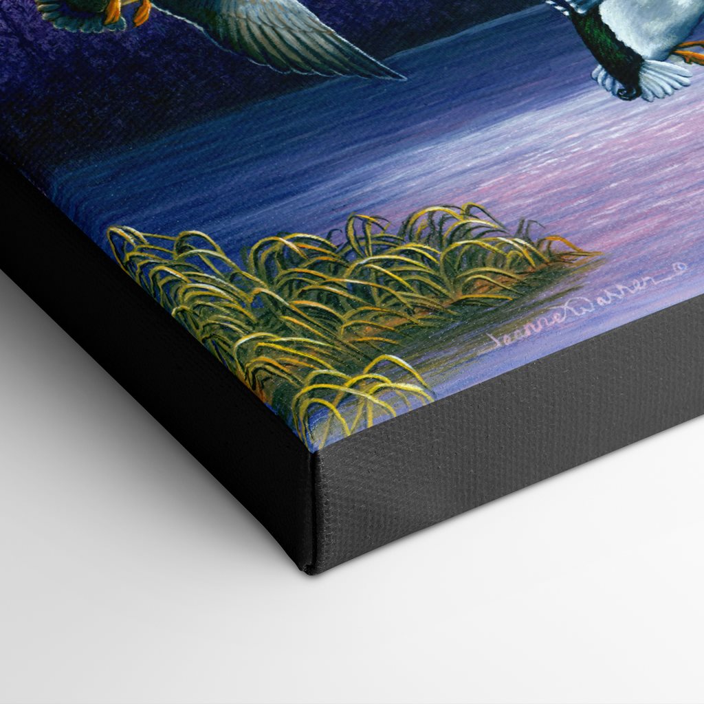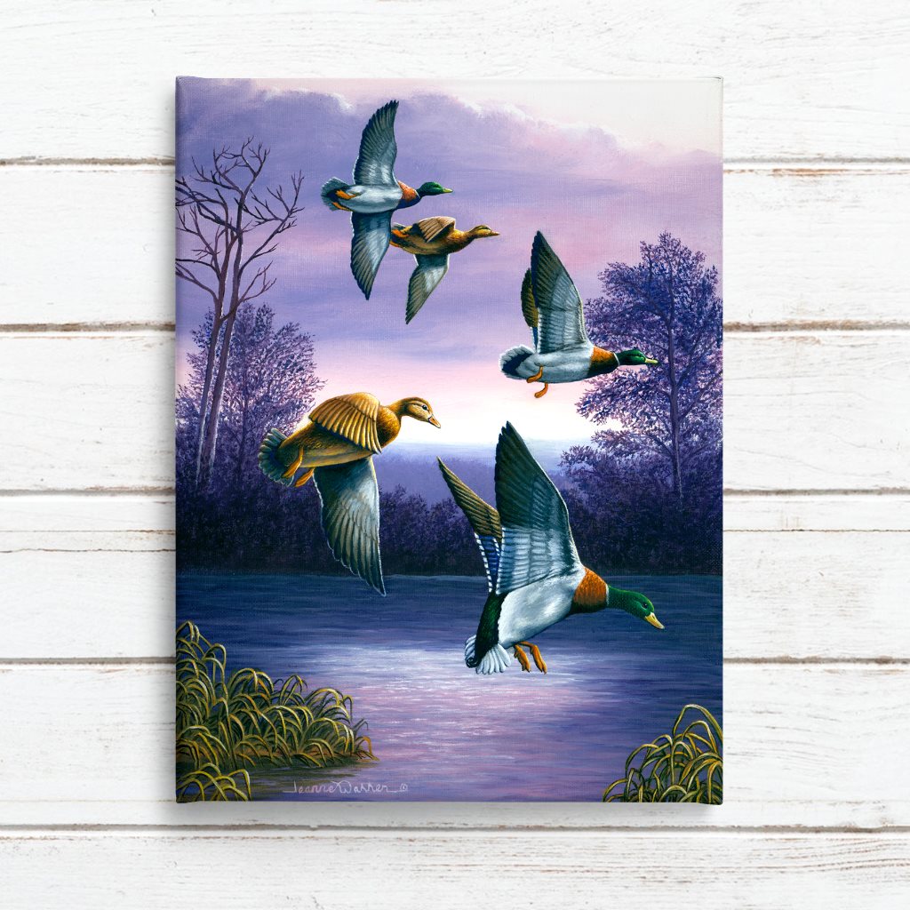 This fine art wildlife print features three male and two female mallard ducks midflight and approaching landing over still marshy waters. A looming sun and wispy clouds paint the trees and water in purples and pinks. Perfect farmhouse or cabin décor!